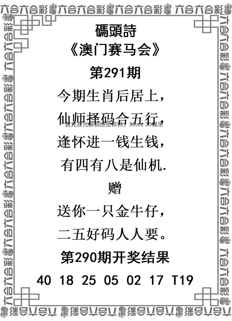 291期澳彩塞马会开狗44中 解:今期生肖后居上,仙师择码合五行,逢怀进一钱生钱,有四有八是仙机。 综合特肖:牛猴鸡狗羊猪 综合主肖:牛猴鸡狗 |